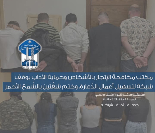 صدر عن المديريّة العامّة لقوى الأمن الدّاخلي ـ شعبة العلاقات العامّةالتّالـــــــــي:في إطار العمل المستمر الذي تقوم به قوى الأمن الدّاخلي لمكافحة الجرائم بمختلف أنواعها، ولا سيّما جرائم الإتجار بالأشخاص وملاحقة شبكات الدّعارة وتوقيف من يديرونها، بتاريخ 4-11-2025، وبنتيجة الاستقصاءات والتّحريّات المكثّفة، تمكّن مكتب مكافحة الإتجار بالأشخاص وحماية الآداب في وحدة …