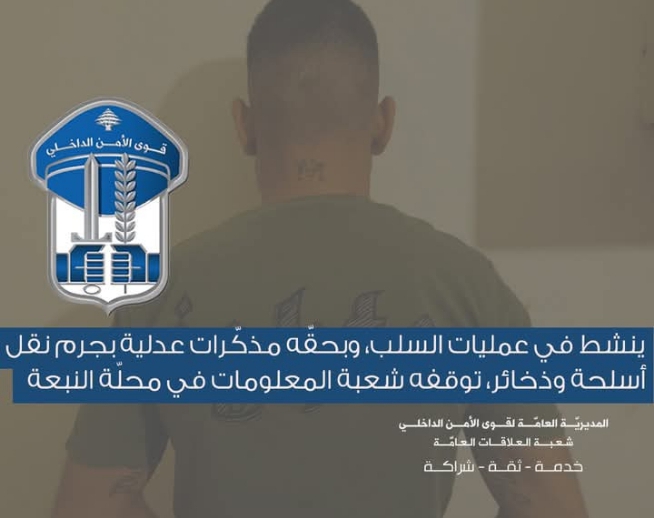 صدر عن المديرية العامة لقوى الأمن الداخلي – شعبة العلاقات العامةالبلاغ التالي:في إطار المتابعة اليومية التي تقوم بها قوى الأمن الداخلي لمكافحة عمليات السلب في مختلف المناطق اللبنانية، توافرت معلومات حول قيام مجهول بتنفيذ عمليات سلب في مناطق جبل لبنان.على أثر ذلك، باشرت القطعات المختصّة في شعبة المعلومات إجراءاتها الميدانية …