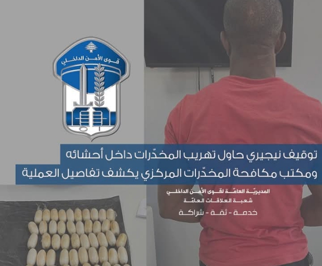 صدر عن المديريّة العامّة لقوى الأمن الدّاخلي – شعبة العلاقات العامّةالبلاغ التّالي:في سياق المتابعة المستمرّة التي تقوم بها قوى الأمن الدّاخلي للحدّ من تهريب المخدّرات، بتاريخ 07-09-2025، اشتبهت ادارة الجمارك – مفرزة ادارة المسافرين في السوق الحرة في مطار رفيق الحريري الدولي، بشخص من التابعيّة النيجيريّة قادما إلى لبنان، بتهريبه …