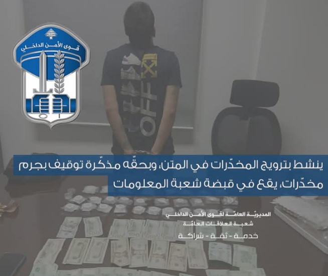 صدر عن المديريّة العامّة لقوى الأمن الدّاخلي ـ شعبة العلاقات العامّةالبلاغ التّالي:في إطار المتابعة المستمرّة التي تقوم بها قوى الأمن الدّاخلي لمكافحة عمليات ترويج المخدّرات في مختلف المناطق اللبنانية، توافرت معطيات لشعبة المعلومات حول قيام شخص مجهول بترويج المخدّرات في مختلف مناطق المتن.على أثر ذلك، أعطيت الأوامر للقطعات المُختصّة في …