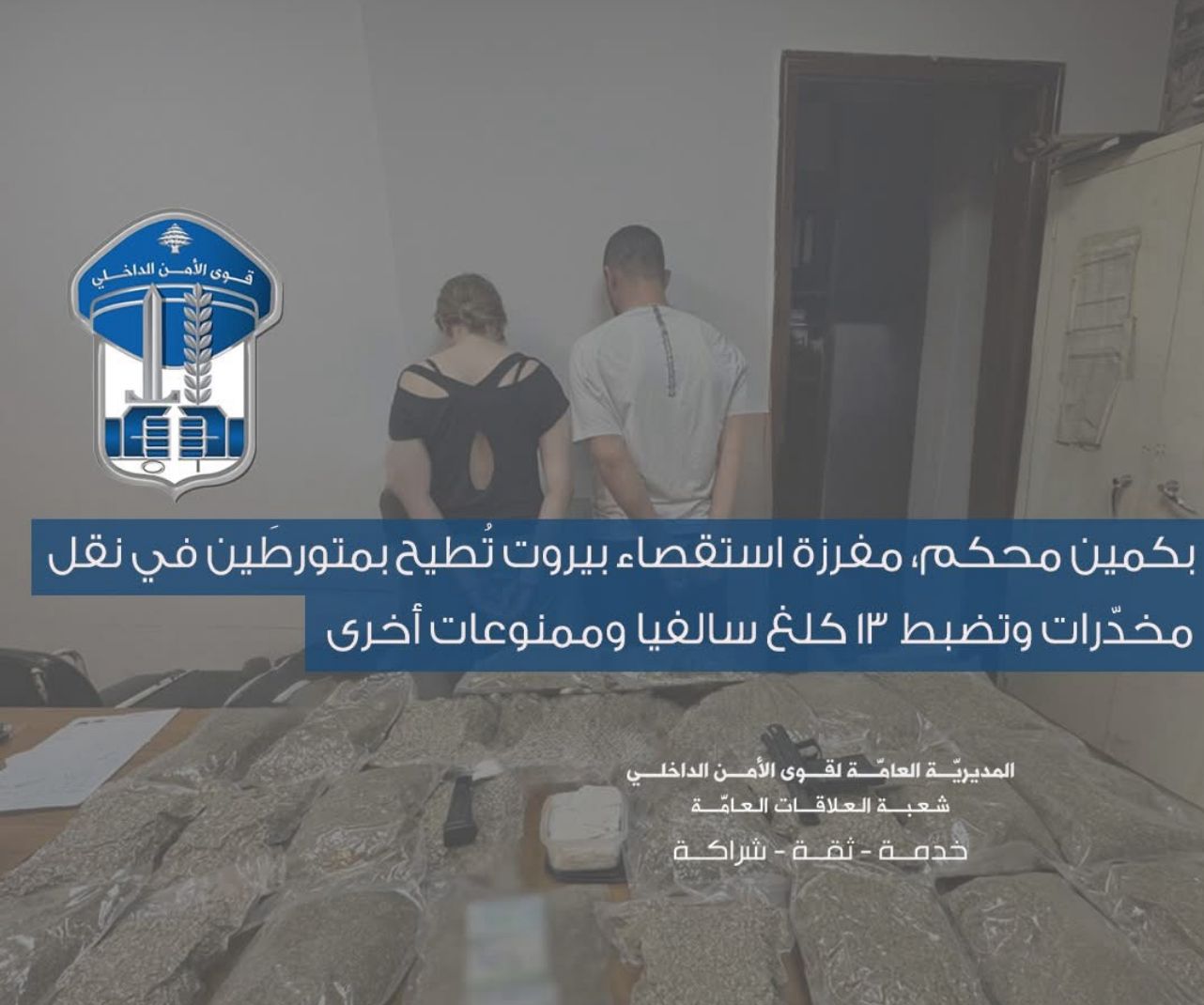 صدر عن المديريّة العامّة لقوى الأمن الدّاخلي ـ شعبة العلاقات العامّةالبلاغ التّالي:في إطار المتابعة المستمرّة التي تقوم بها قوى الأمن الداخلي لمكافحة جميع أنواع الجرائم في مختلف المناطق اللبنانية، ولا سيّما تلك المتعلّقة بعمليات تجارة المخدّرات وترويجها، توافرت معطيات لمفرزة استقصاء بيروت حول قيام شخصَين بنقل كمية من المواد المخدِّرة …