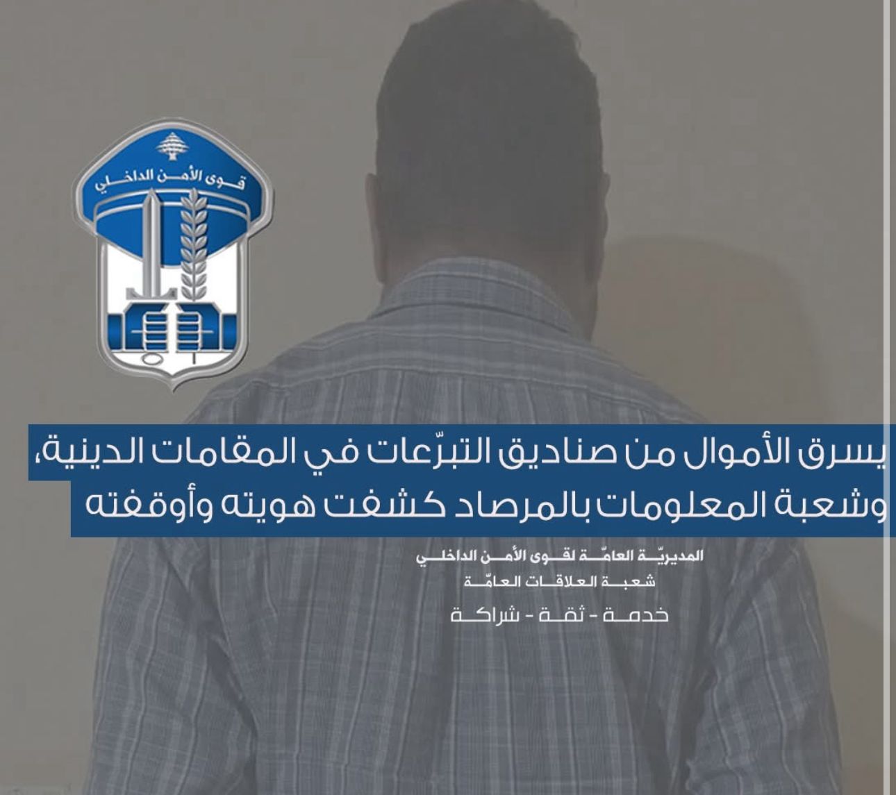 صدر عن المديريّة العامّة لقوى الأمن الدّاخلي ـ شعبة العلاقات العامّة:البلاغ التّاليفي إطار المتابعة اليوميّة التي تقوم بها قوى الأمن الدّاخلي بمختلف قطعاتها، للحدّ من عمليّات السّرقة في المناطق اللّبنانية كافّة، توافرت معطيات لدى شعبة المعلومات حول قيام شخص مجهول الهويّة بتنفيذ عمليّات سرقة أموال من داخل صناديق التّبرّعات والنذورات …