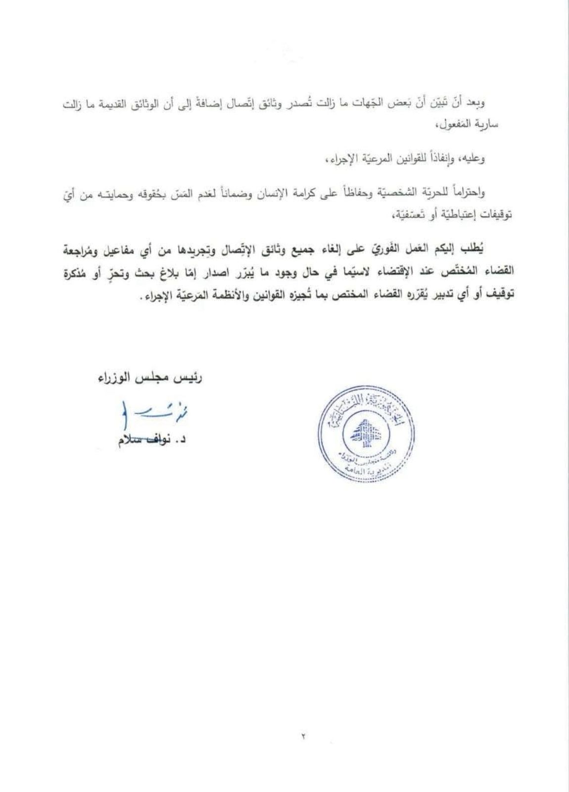 مذكرة حكومية الى الاجهزة الأمنية والعسكرية للتأكيد على وجوب الغاء وثائق الاتصال ولوائح الاخضاع بشكل فوري والاستعاضة عنها بمراجعة القضاء المختص احتراماً للحرية الشخصية وحفاظاً على الكرامات وضماناً لعدم المس بحقوق المواطنين من اي توقيفات اعتباطية او تعسفية.