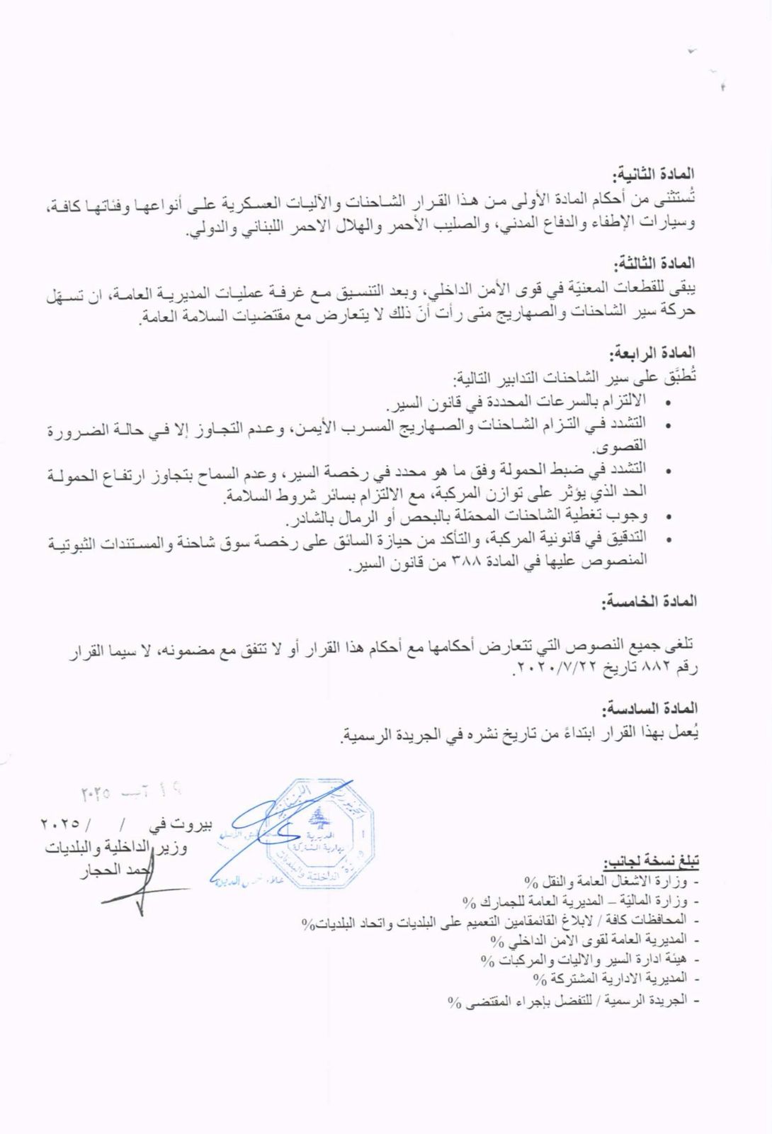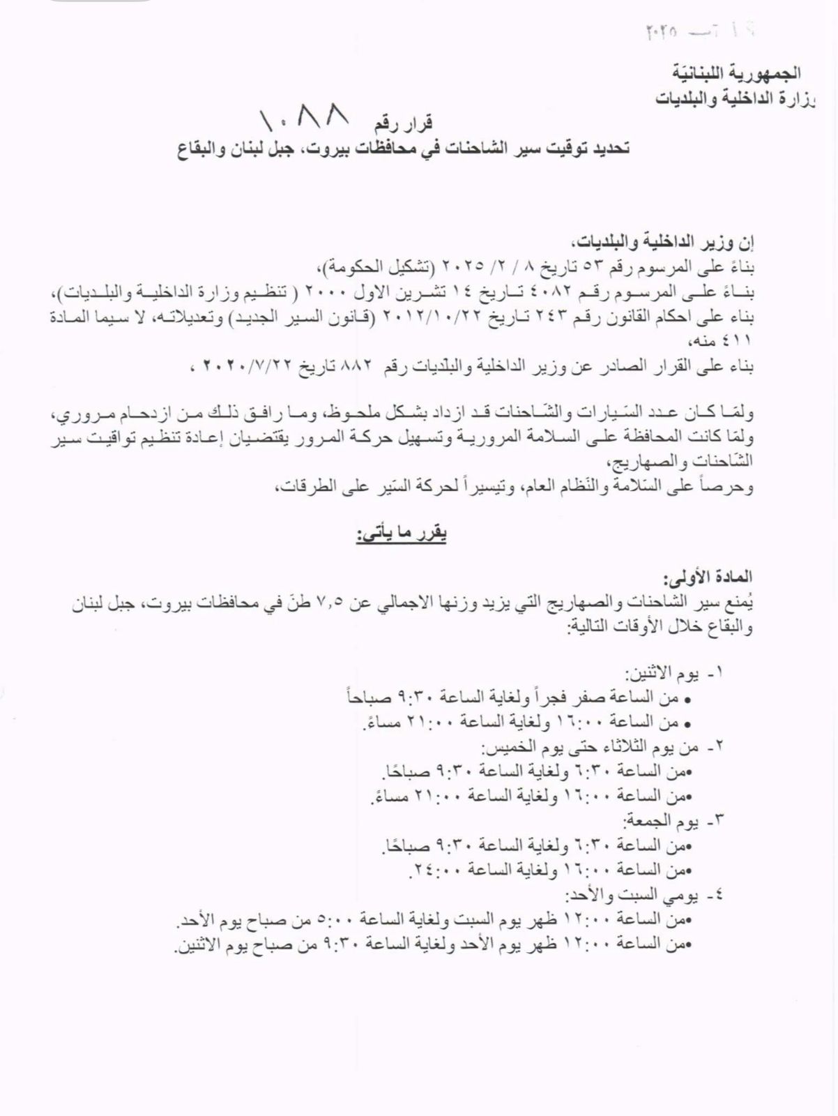 أصدرت وزارة الداخلية قرارها الذي يحمل رقم 1088، والذي يُحدّد توقيت سير الشاحنات في محافظات بيروت جبل لبنان والبقاع