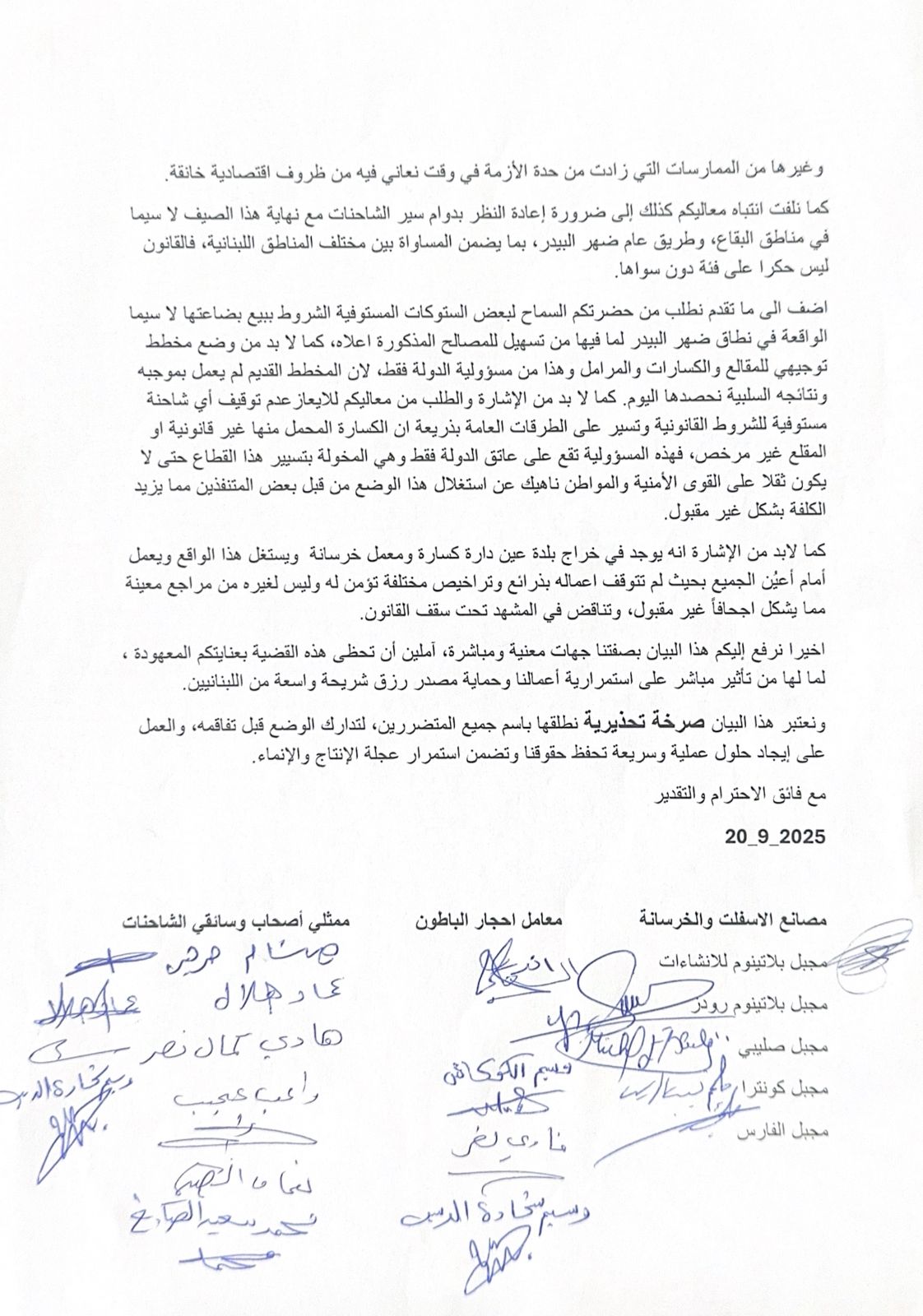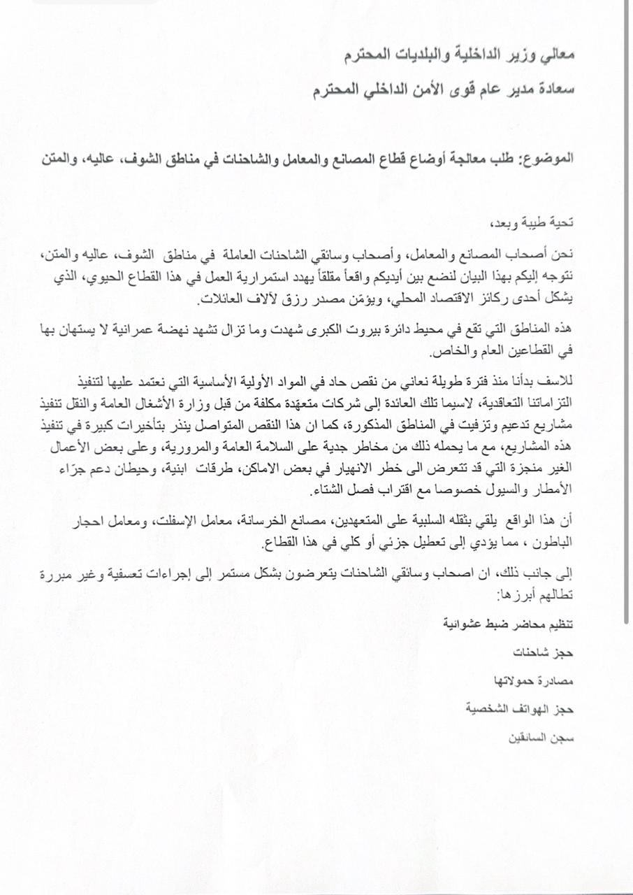 نحن أصحاب المصانع والمعامل، وأصحاب وسائقي الشاحنات العاملة في مناطق الشوف، عاليه، والمتن، نتوجه إليكم بهذا البيان لنضع بين أيديكم واقعاً مقلقاً يهدد استمرارية العمل في هذا القطاع الحيوي الذي يشكل أحد ركائز الاقتصاد المحلي، ويوفر مصدر رزق لآلاف العائلات.