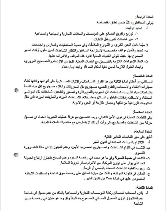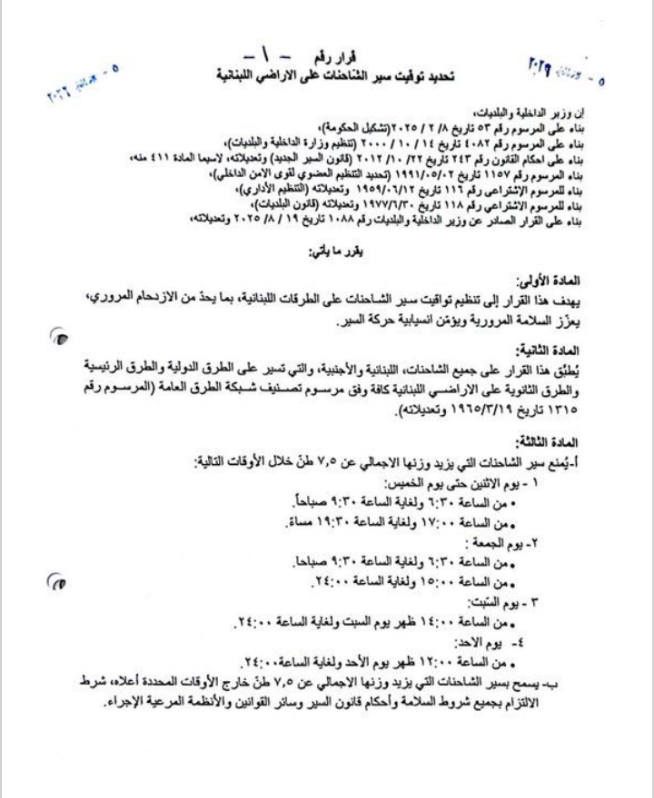 عممت وزارة الداخلية والبلديات على حسابها على منصة “إكس”، القرار رقم 1 تاريخ 2026/1/5 حول تنظيم إجراءات وتوقيت سير الشاحنات على الأراضي كافة.