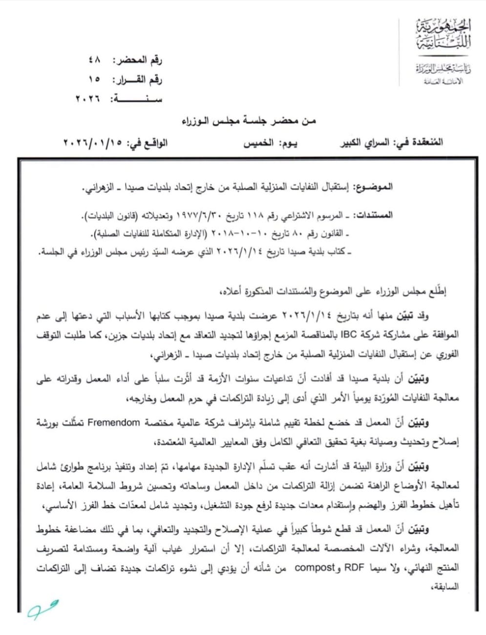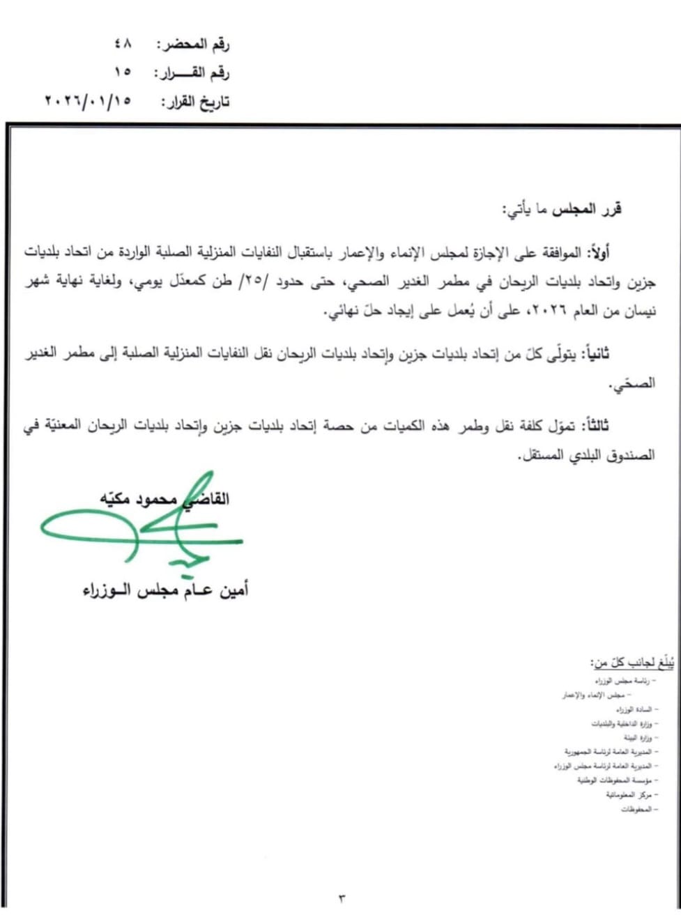 اتّخذ مجلس الوزراء في جلسته الأخيرة قرارًا يقضي برمي نفايات “اتحاد بلديات جزين” و”اتحاد بلديات الريحان” في مطمر “الكوستابرافا”، الواقع ضمن النطاق البلدي لمدينة الشويفات، في خطوة من شأنها تفجير أزمة جديدة في ملف النفايات.