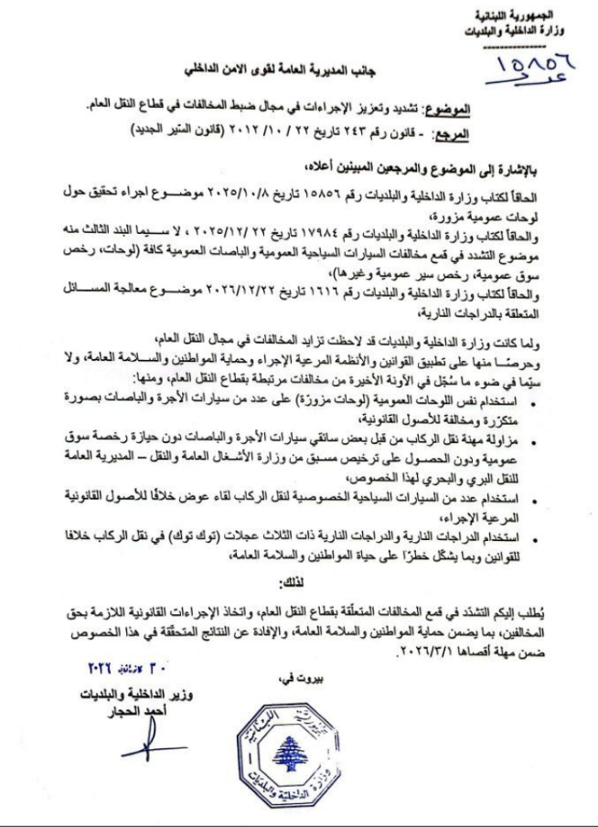 اعلنت وزارة الداخلية والبلديات على منصة إكس” أنه “نظرًا إلى تزايد المخالفات في قطاع النقل العام، ولا سيّما استخدام لوحات عمومية مزوّرة، وعدم حيازة رخص سوق عمومية، واستعمال سيارات سياحية خصوصية لنقل الركاب، وغيرها من المخالفات، أصدر وزير الداخلية والبلديات أحمد الحجار تعميمًا، إلحاقًا بالتعاميم السابقة، يقضي بتشديد الإجراءات وتعزيز ضبط مخالفات النقل العام، وذلك في إطار السلامة العامة وتنظيمًا للقطاع”.