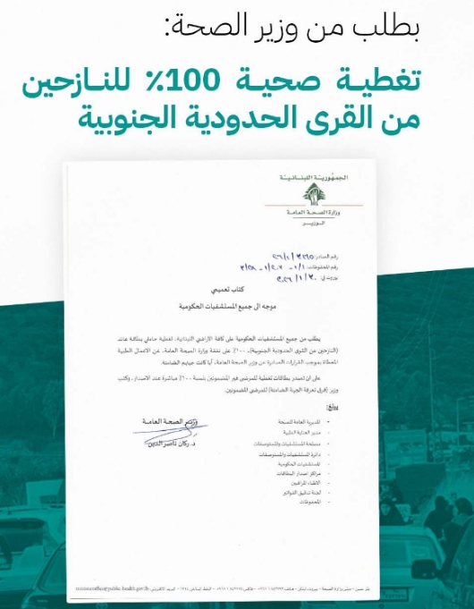 أصدرت وزارة الصحة، تعميماً، موجهاً إلى جميع المستشفيات الحكومية على الاراضي اللبنانية كافة، تغطية كلفة النازحين من القرى الحدودية الجنوبية، بنسبة 100% على نفقة وزارة الصحة العامة، عن الأعمال الطبية المعطاة بموجب القرارات الصادرة عن وزير الصحة العامة، أياً كانت جهتهم الضامنة.