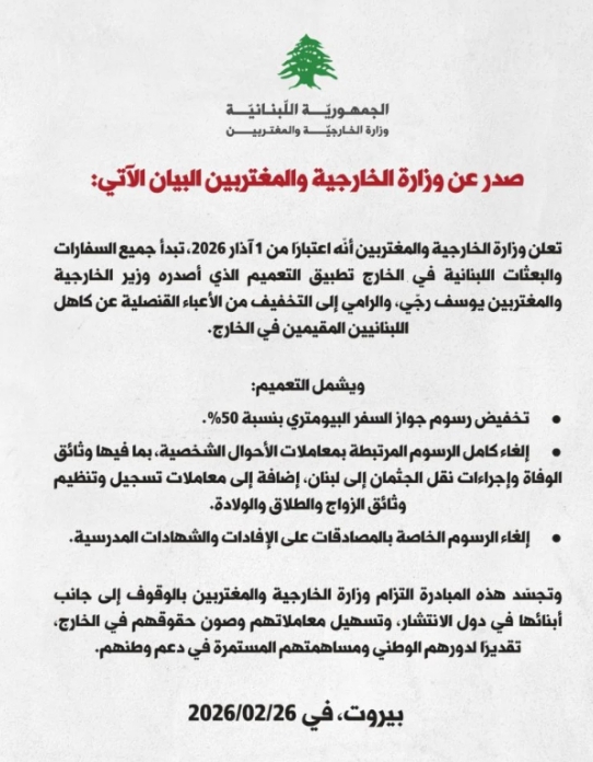 أعلنت وزارة الخارجية والمغتربين، في بيان، أنّه اعتبارًا من تاريخ 1/3/2026، ستباشر جميع السفارات والبعثات اللبنانية في الخارج تطبيق التعميم الصادر عن وزير الخارجية والمغتربين يوسف رجّي، والهادف إلى التخفيف من الأعباء القنصلية عن كاهل اللبنانيين المقيمين في دول الاغتراب.