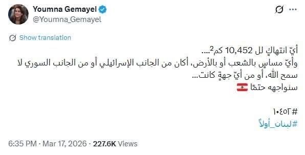كتب رئيس الحزب الديمقراطي اللبناني طلال أرسلان عبر حسابه على منصّة “إكس”: “عندما قرأتُ بالأمس ما عبّرت عنه السيدة المحترمة والعزيزة يمنى الجميل، لم أستطع إلا أن أُثني على هذا الموقف وأحترمه، والذي إن دلّ على شيء، فإنما يدلّ على احترام الذات والقيم الوطنية النبيلة العابرة للاصطفافات المقيتة، المذهبية والطائفية والعنصرية المريضة، التي نعيشها في أيامنا هذه.. مع الأسف الشديد”.