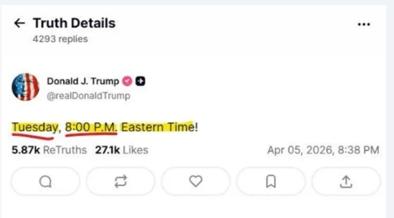 وكتب ترامب: “الثلاثاء، الساعة 8:00 مساء، بتوقيت الساحل الشرقي”، من دون تقديم أي تفاصيل إضافية، ما فُسّر على أنه إشارة إلى توقيت الضربة التي توعّد بشنّها.
